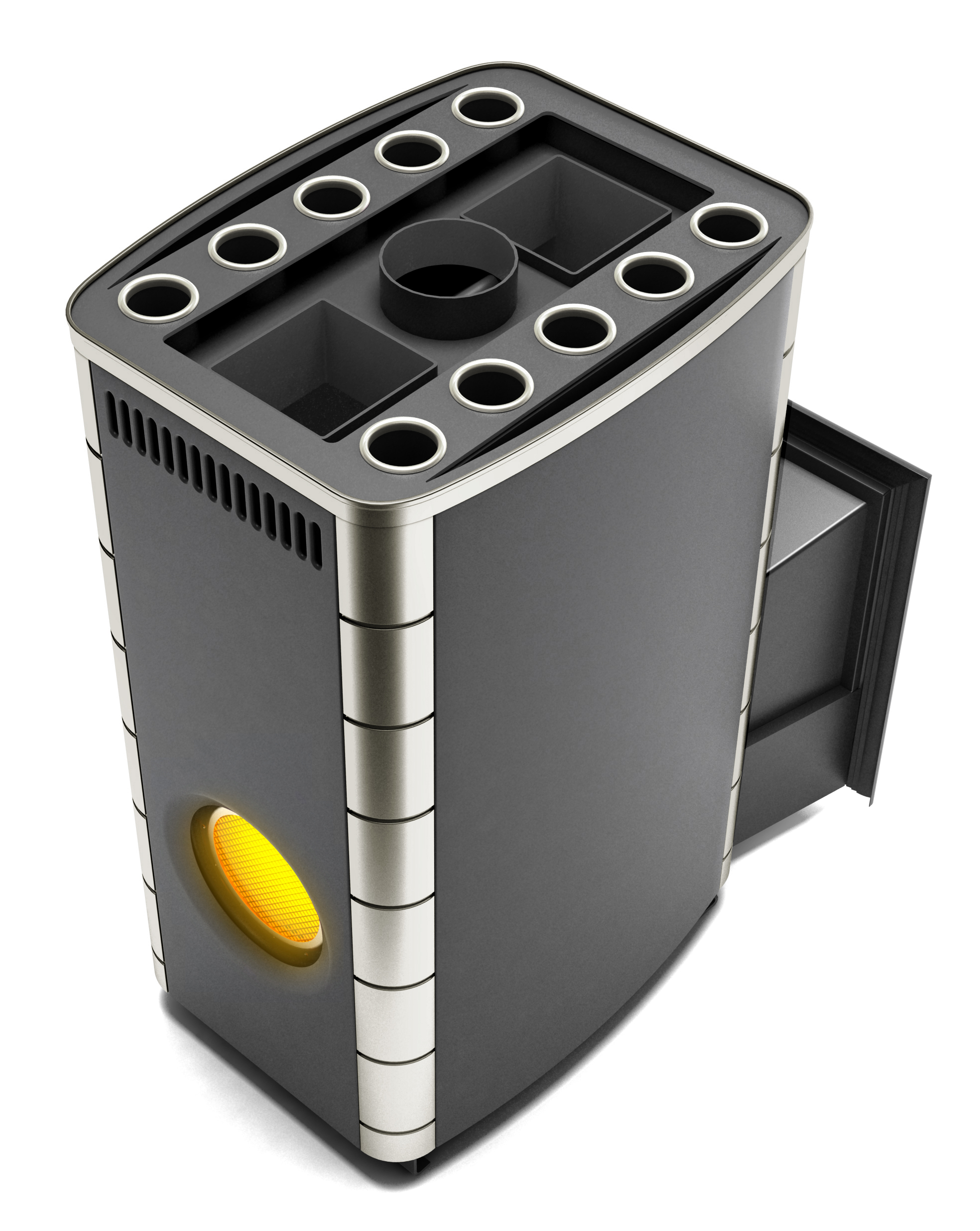 Быстрый нагрев парилки обеспечивает двухрядный десятицилиндровый теплообменник, который значительно увеличивает поверхность нагрева печи, не изменяя ее габариты. Глубокая закрытая каменка прогревается пламенем со всех сторон, обеспечивая качественный прогрев каменной закладки.